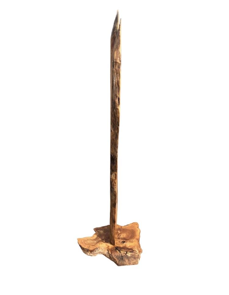 Die Bodenplatte besteht aus einer massiven, dicken Baumscheibe eines 210–230 Jahre alten Olivenbaums, während die darauf stabil montierte Hauptplatte von einem über 600 Jahre alten Olivenbaum stammt. Beide Teile sind miteinander verschraubt und lassen sich für den Transport oder Versand einfach abnehmen.