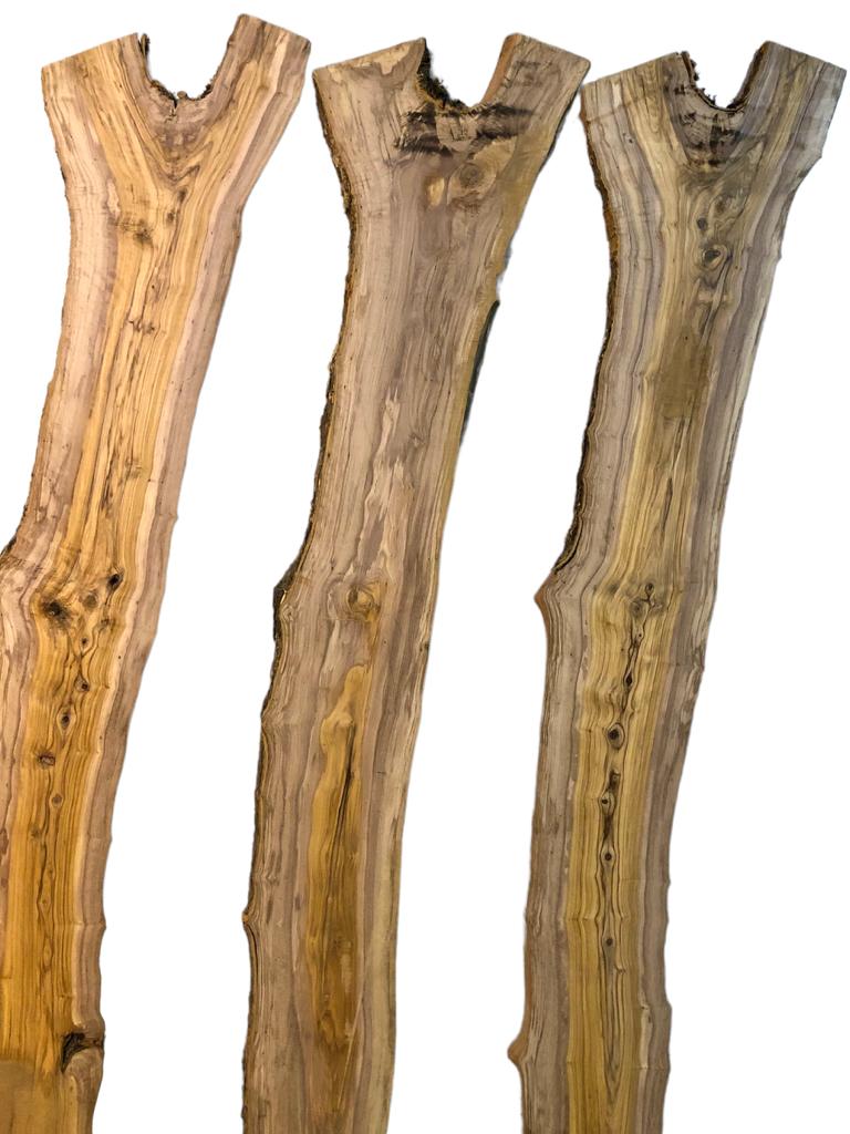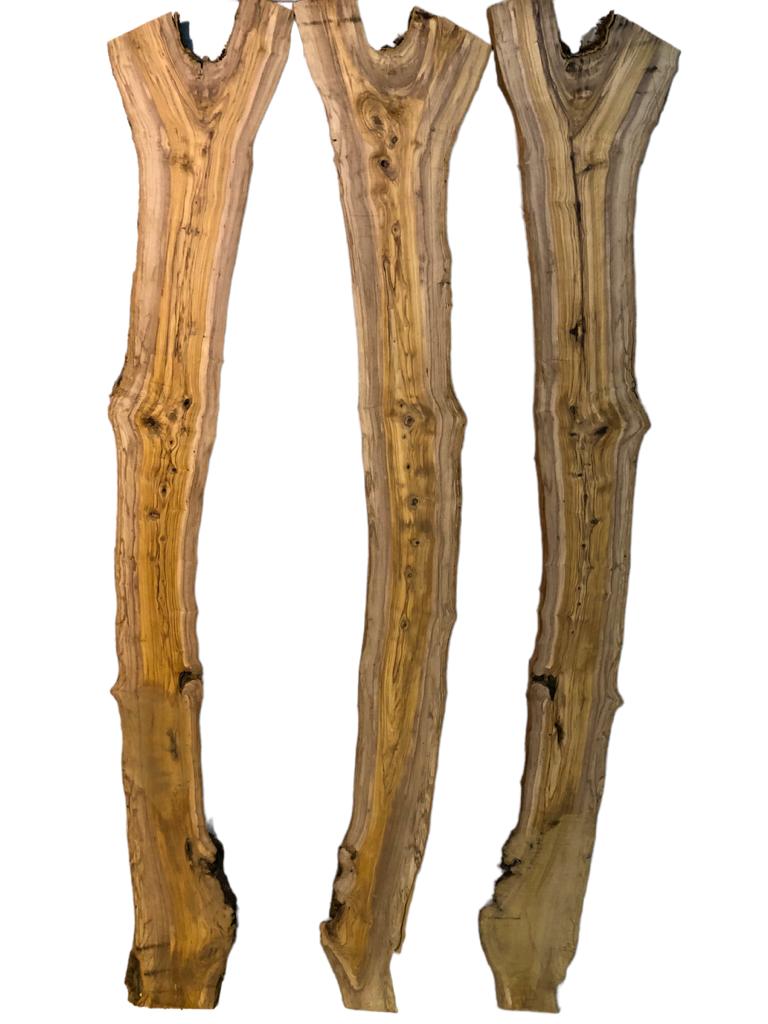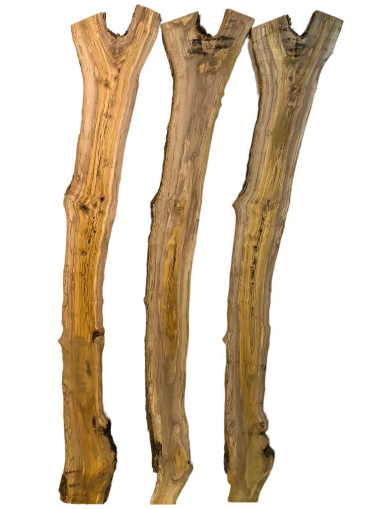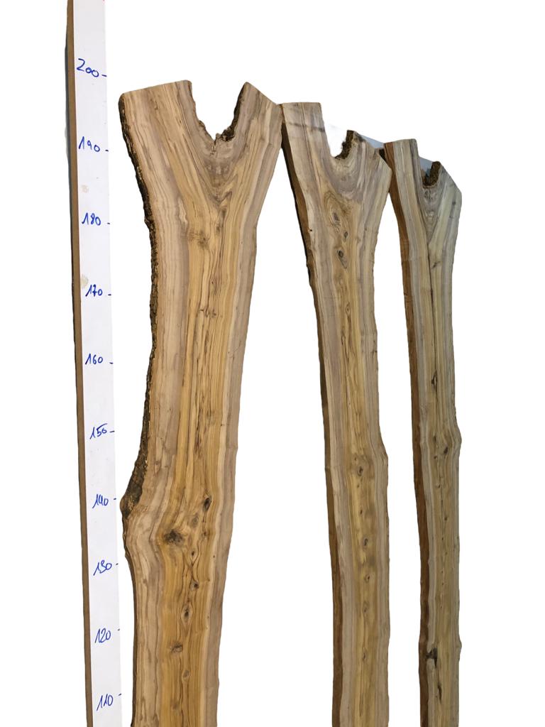 Diese drei Olivenholz Bohlen, die hintereinander aus demselben Stamm gesägt wurden, überzeugen durch ihre außergewöhnlich interessante Färbung und natürliche Struktur. Die Bohlen sind massiv, stabil und durch ihre schlanke Form dennoch leicht, was sie zu einer hervorragenden Wahl für kreative Projekte macht.