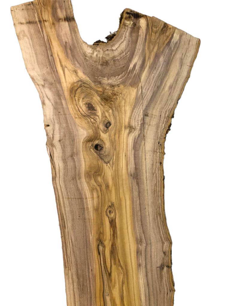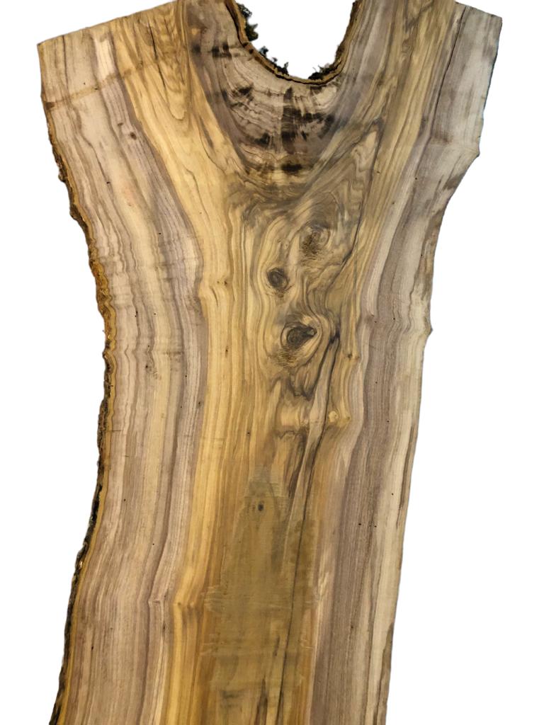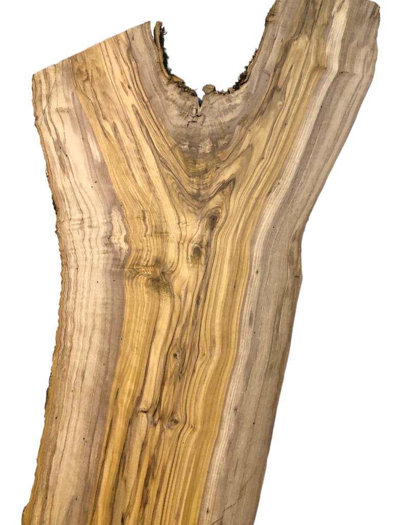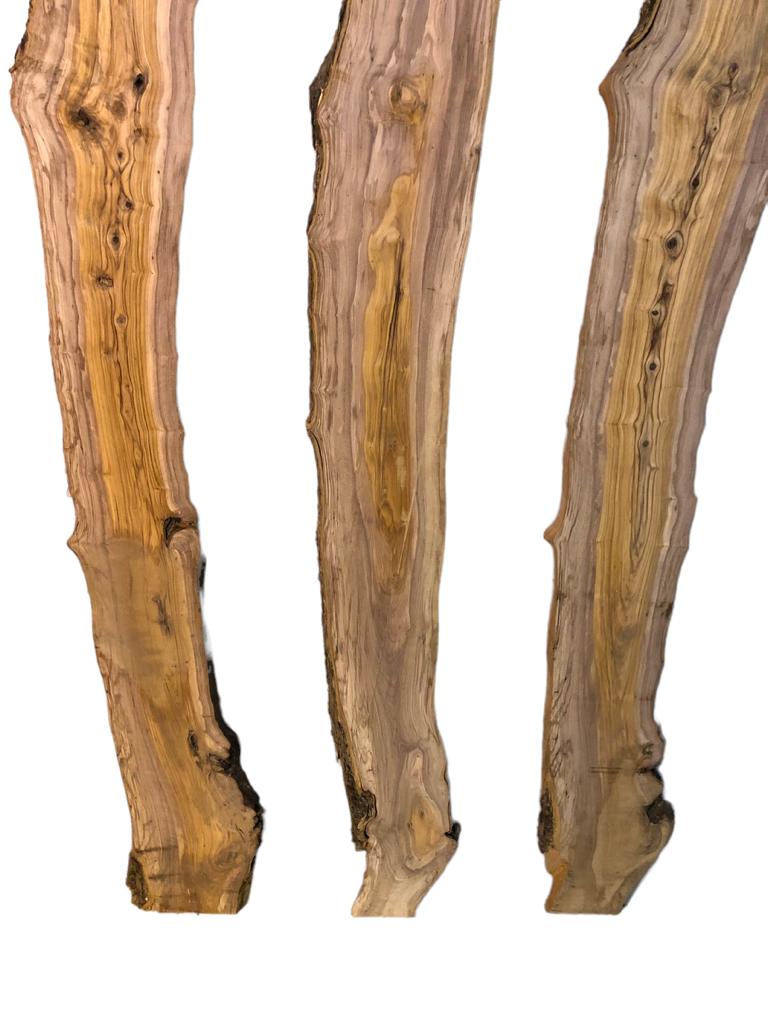Diese drei Olivenholz Bohlen, die hintereinander aus demselben Stamm gesägt wurden, überzeugen durch ihre außergewöhnlich interessante Färbung und natürliche Struktur. Die Bohlen sind massiv, stabil und durch ihre schlanke Form dennoch leicht, was sie zu einer hervorragenden Wahl für kreative Projekte macht.