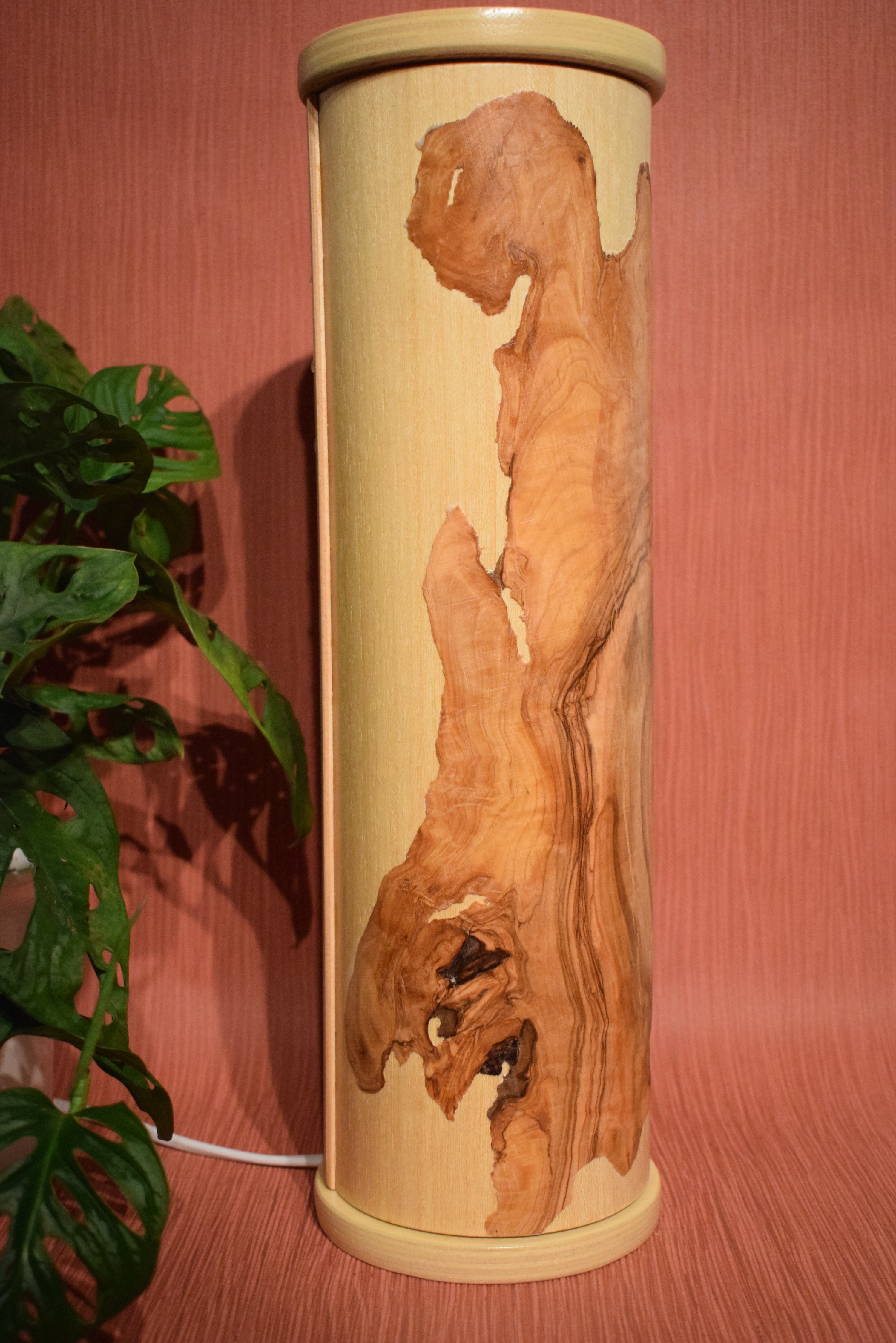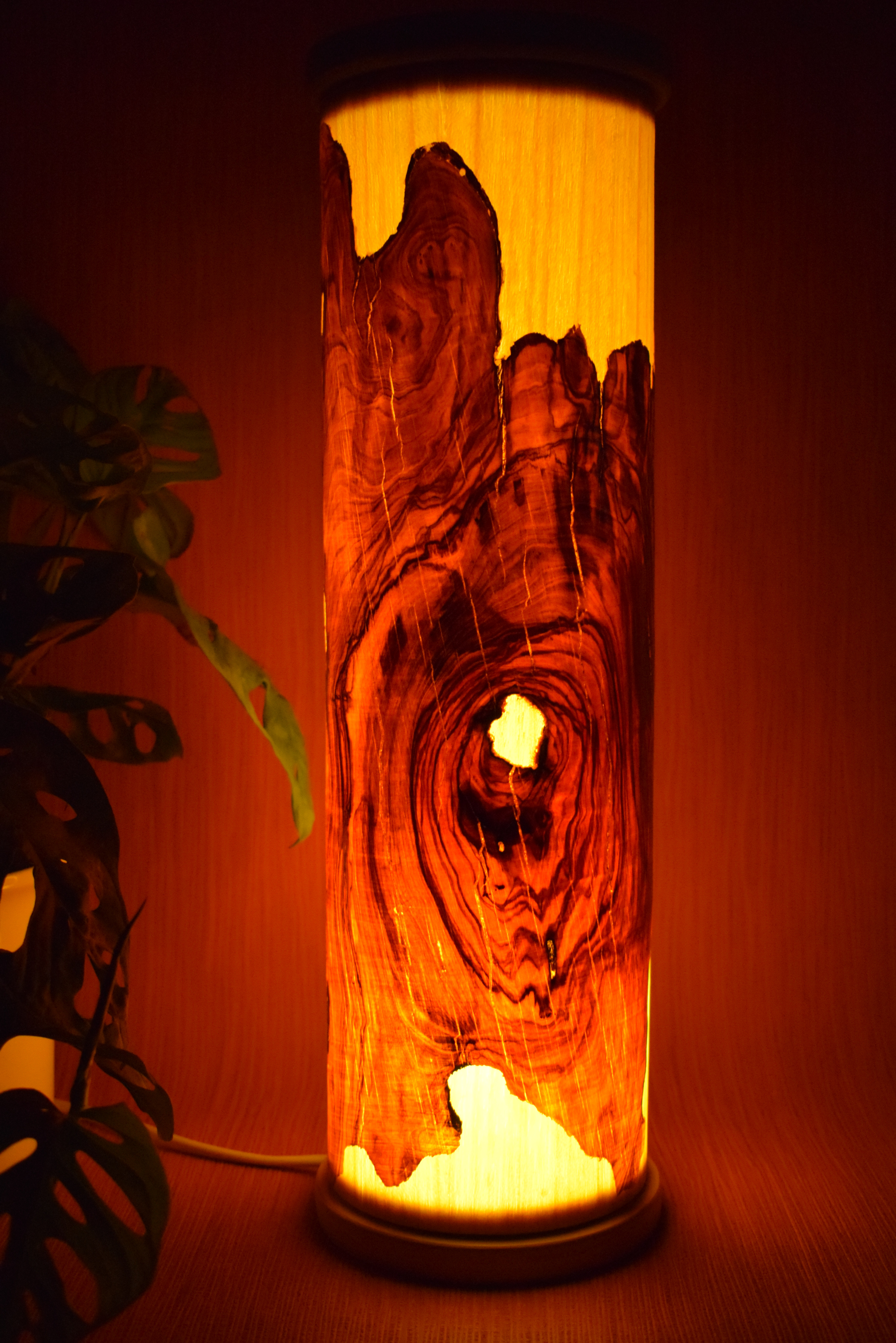Ob als Schreibtischlampe oder Nachttischlampe, diese atmosphärische Lichtsäule mit speziell aufgearbeitetem Olivenholz Furnier schenkt jedem Raum ein warmes und stimmungsvolles Ambiente. Sie kann auch als herabhängende Lampe verwendet werden; hierfür ist nur ein kleiner Umbau an der Bodenplatte nötig: Bohrens an der dafür vorgezeichneten Stelle und das Durchstecken des Kabels ermöglicht eine flexible Nutzung.