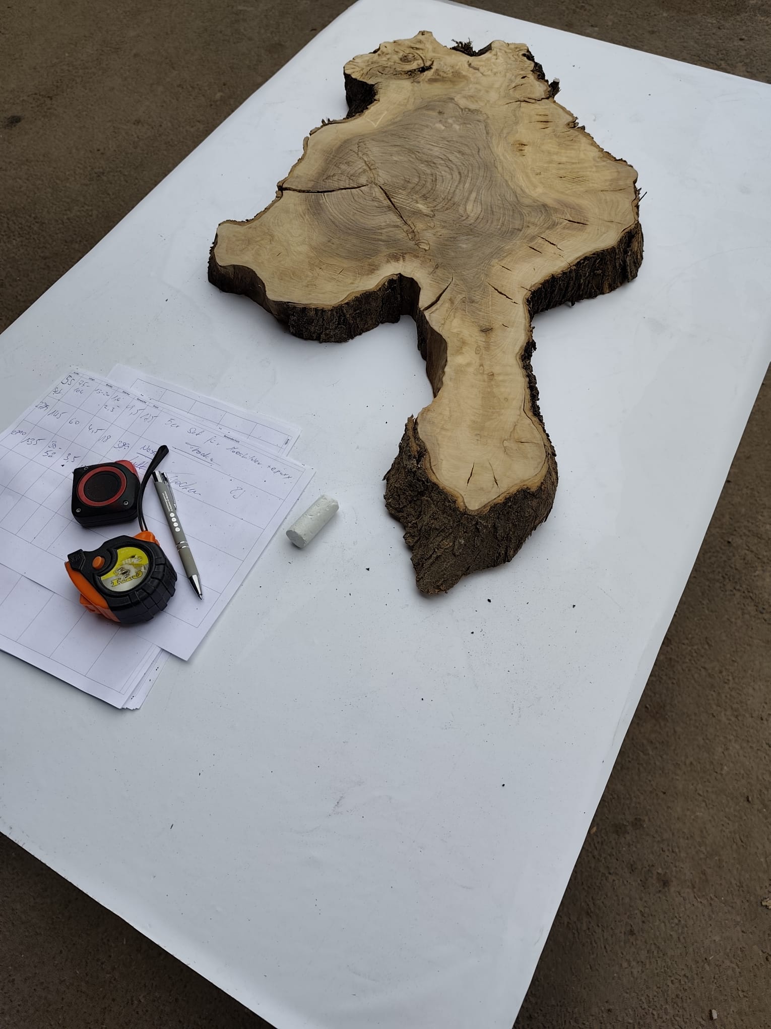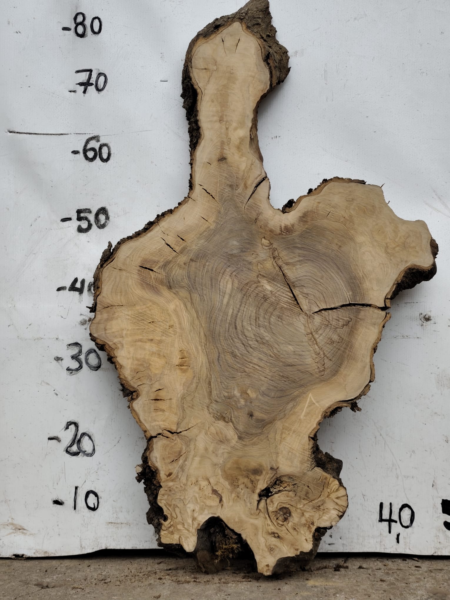 Es handelt sich um trockenes Olivenholz, das über viele Jahre luftgetrocknet wurde. Die Scheibe ist stabil, plan und gerade und wurde auf einer Seite bereits grob vorgeschliffen, sodass die Maserung gut zur Geltung kommt.