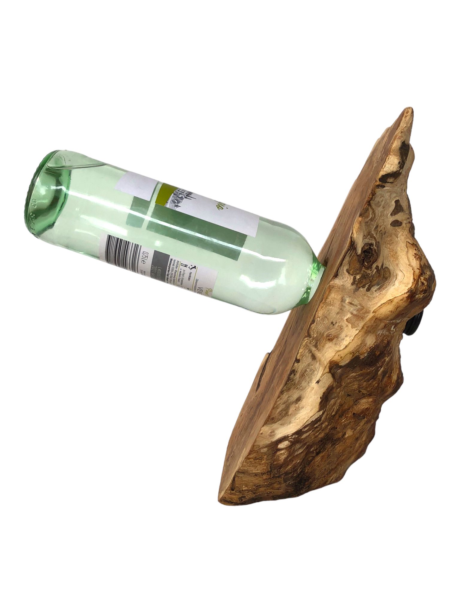 Allein durch das Gewicht der Flasche steht dieser Olivenholzflaschenhalter wie von Zauberhand.