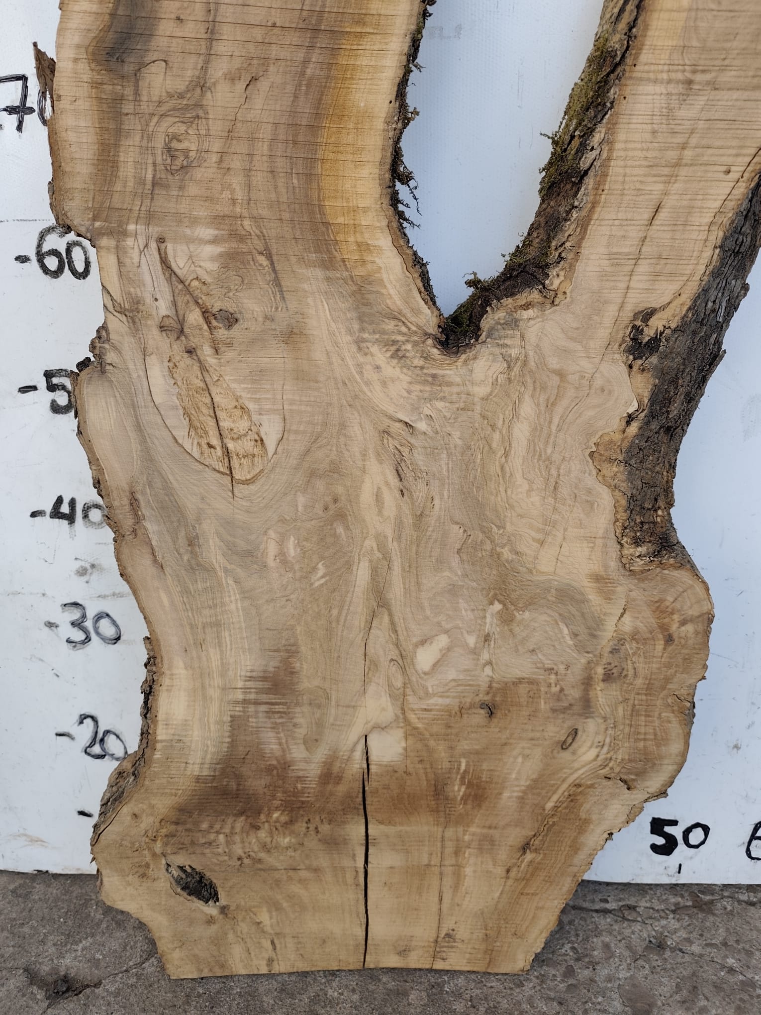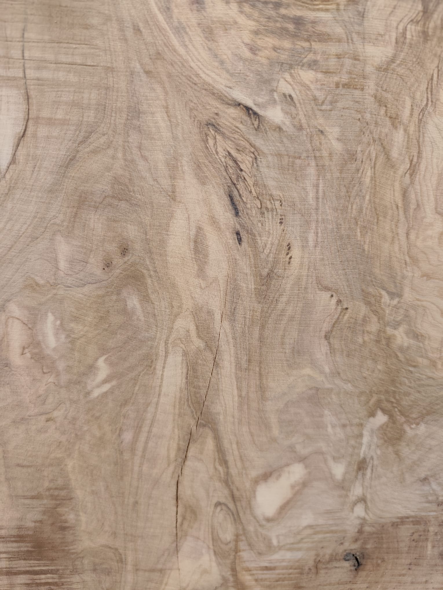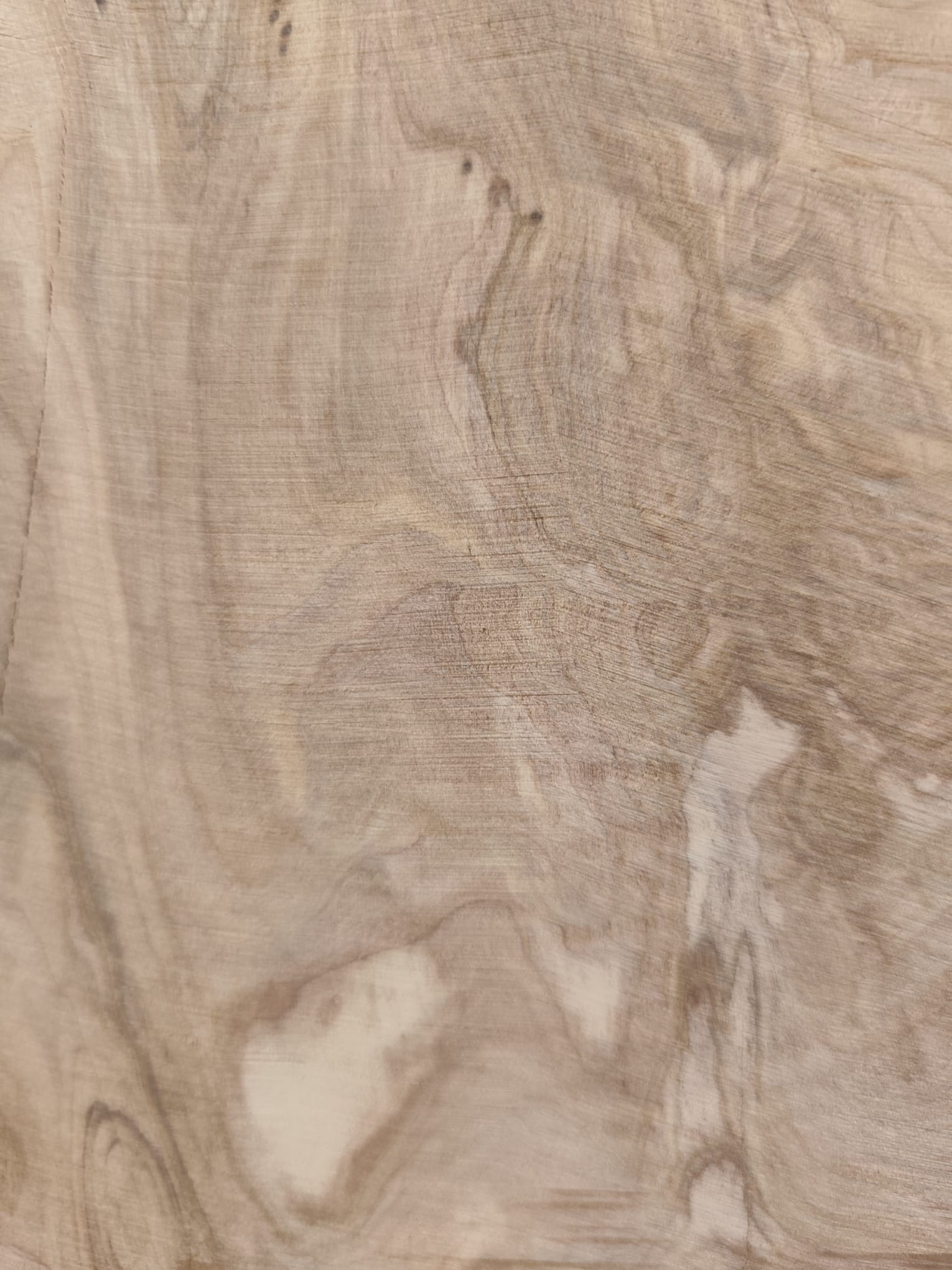 Es handelt sich um trockenes Olivenholz, das über 8 Jahre schonend luftgetrocknet wurde. Die Platte ist plan, stabil und direkt zur Weiterverarbeitung geeignet. An einer Stelle wurde sie leicht angeschliffen, sodass die beeindruckende Maserung bereits sichtbar wird.
