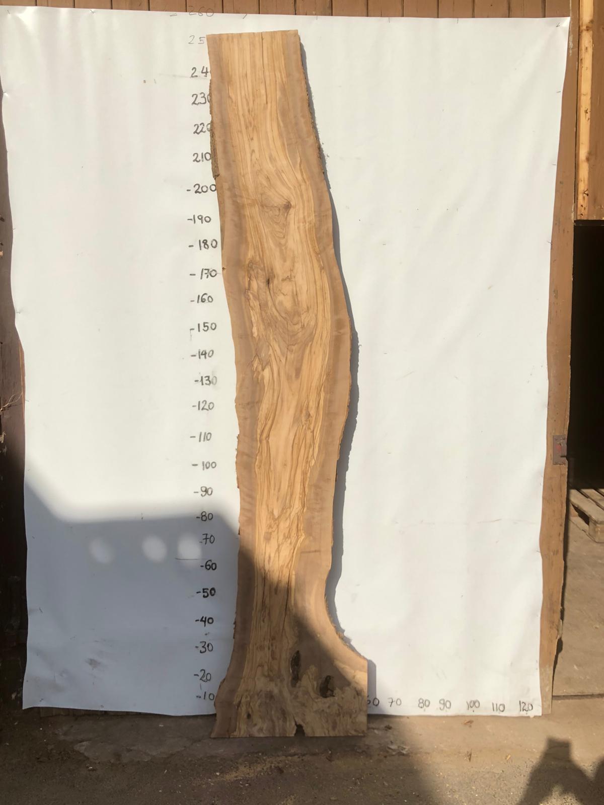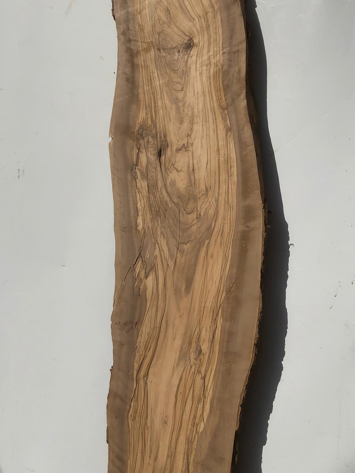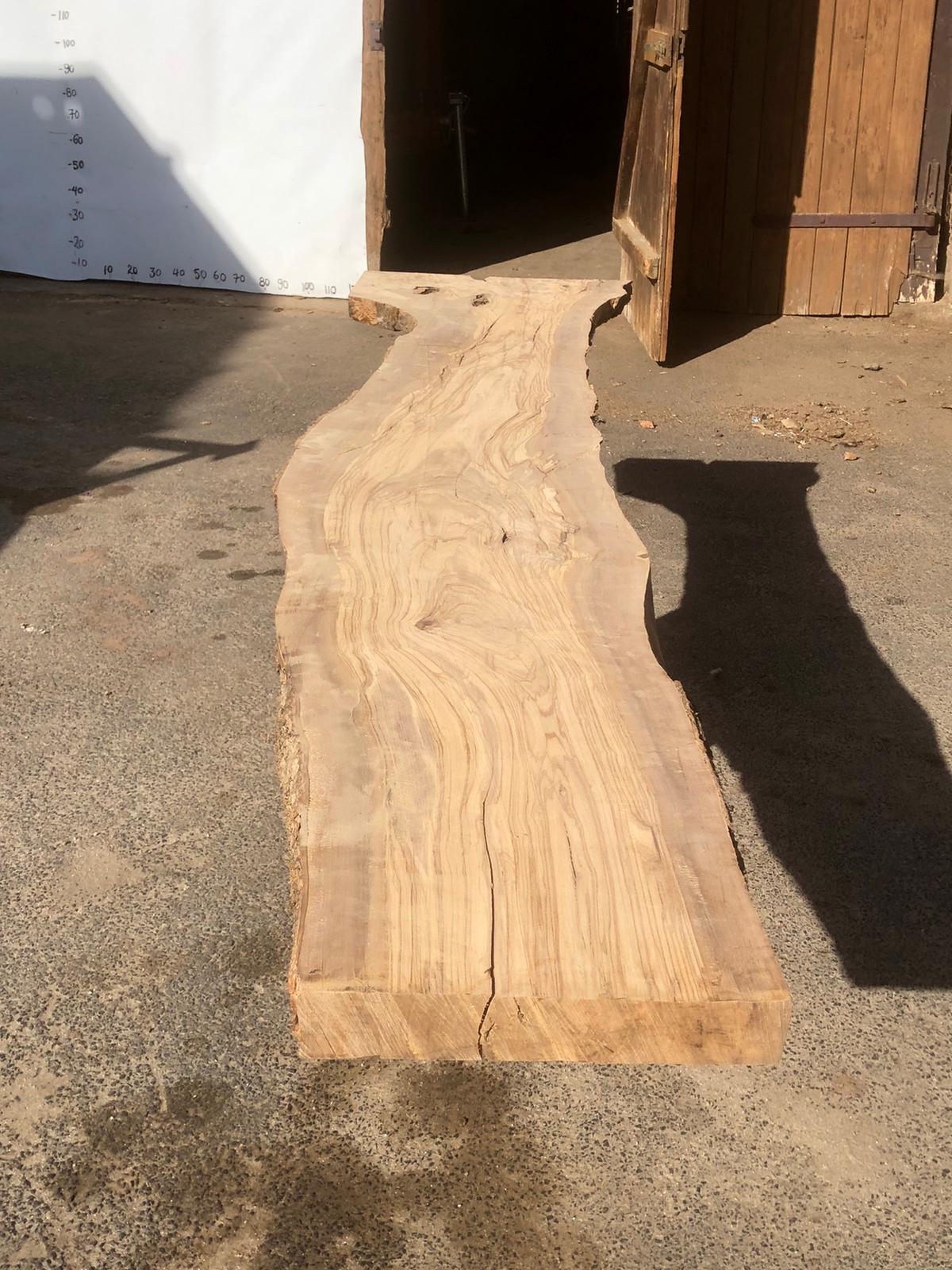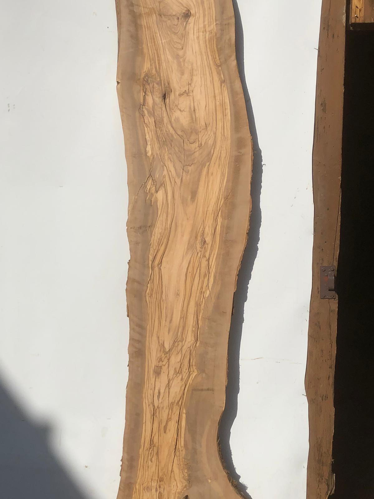 Diese beeindruckende Olivenholz Bohle besticht durch ihre außergewöhnliche Länge und Breite, und ist zugleich fast gerade gewachsen, was sie zu einer Rarität macht. Sie weist nur wenige Löcher und Risse auf, was für Olivenholz in dieser Größe selten ist und die hohe Qualität dieses Naturprodukts unterstreicht.