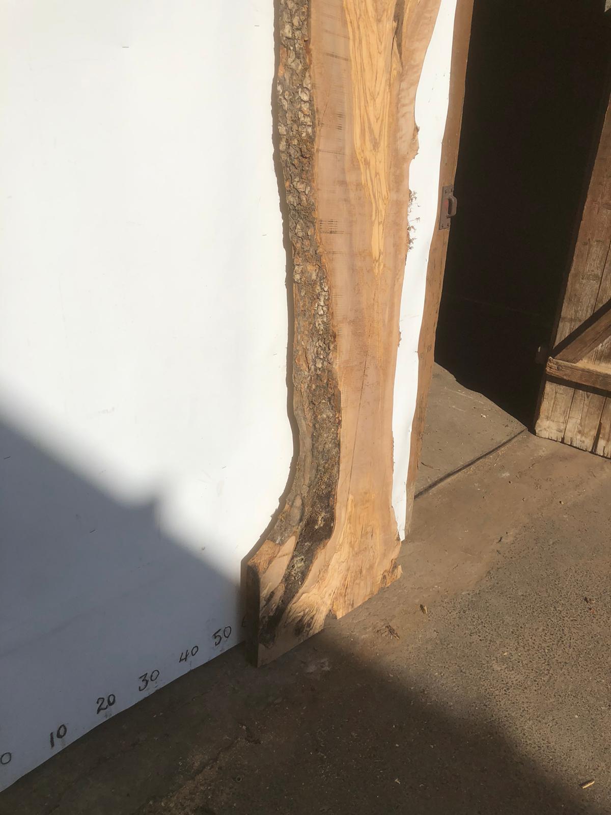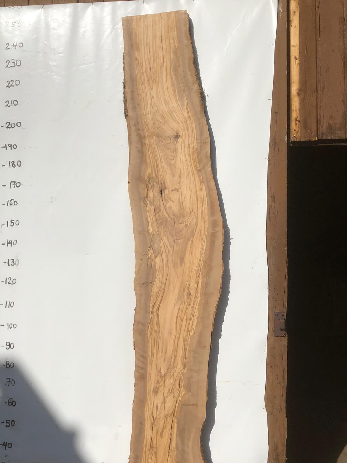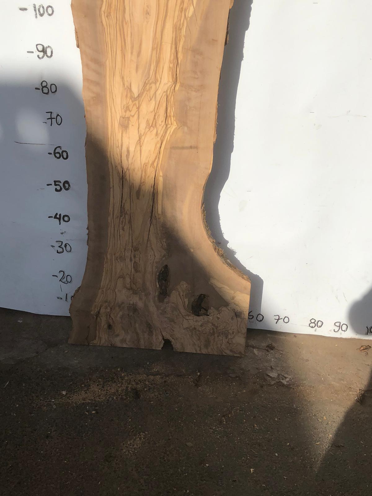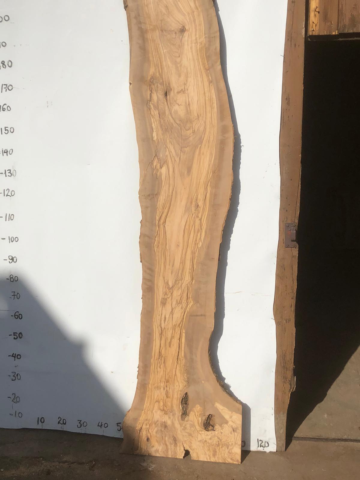 Diese beeindruckende Olivenholz Bohle besticht durch ihre außergewöhnliche Länge und Breite, und ist zugleich fast gerade gewachsen, was sie zu einer Rarität macht. Sie weist nur wenige Löcher und Risse auf, was für Olivenholz in dieser Größe selten ist und die hohe Qualität dieses Naturprodukts unterstreicht.