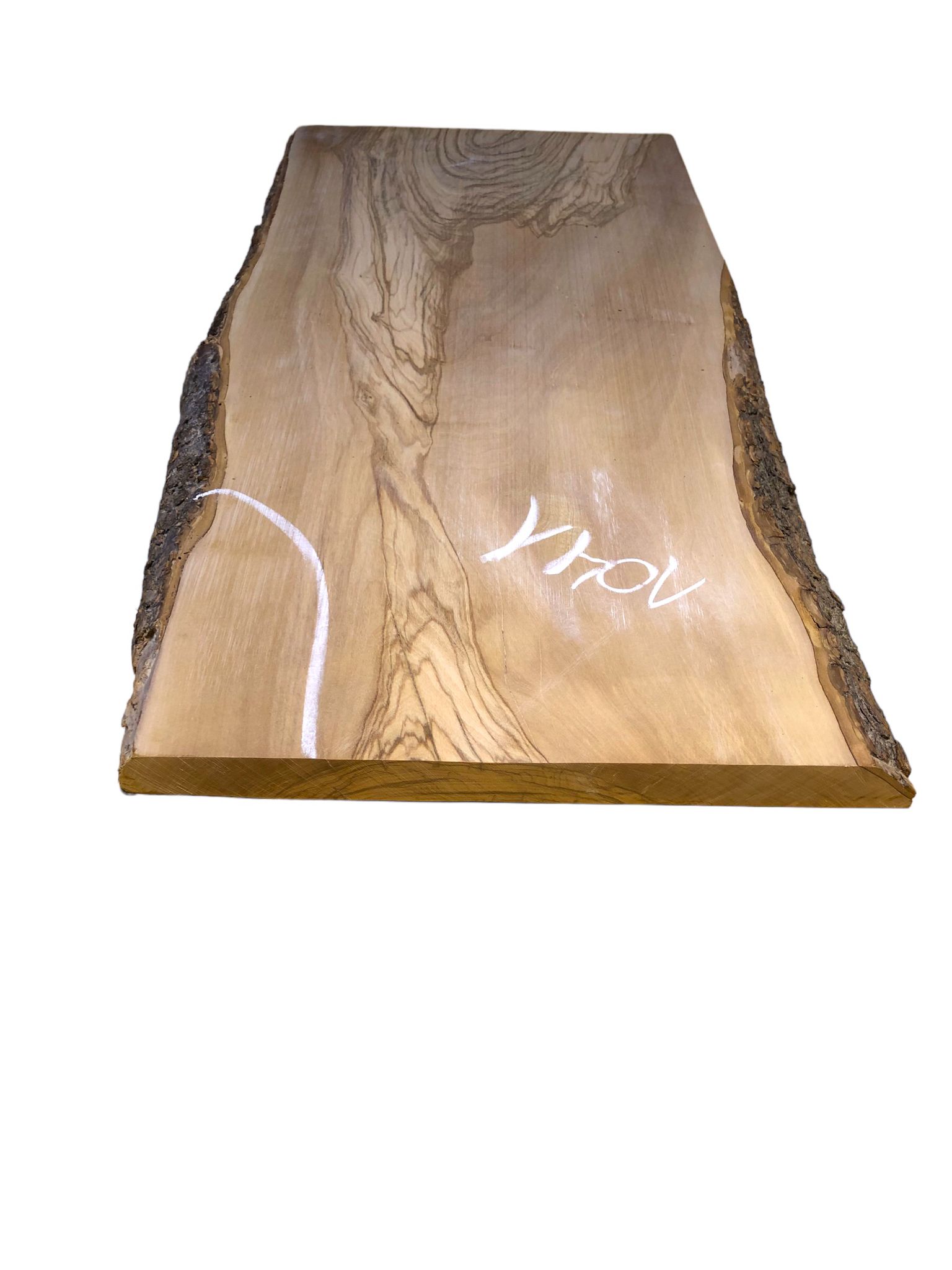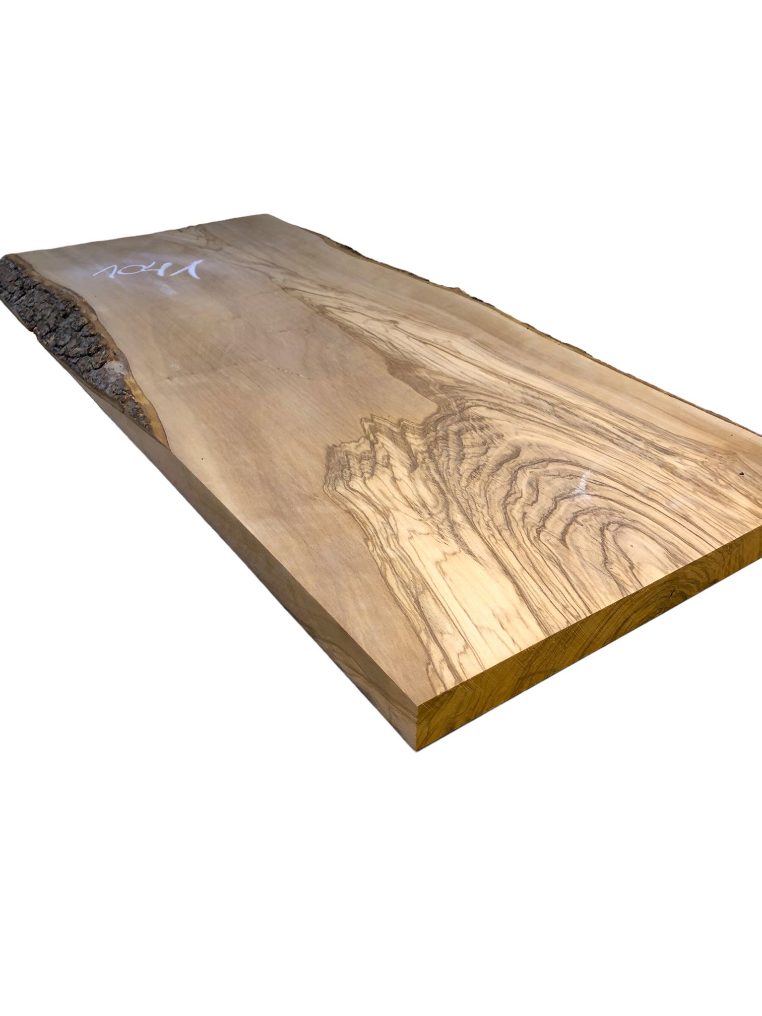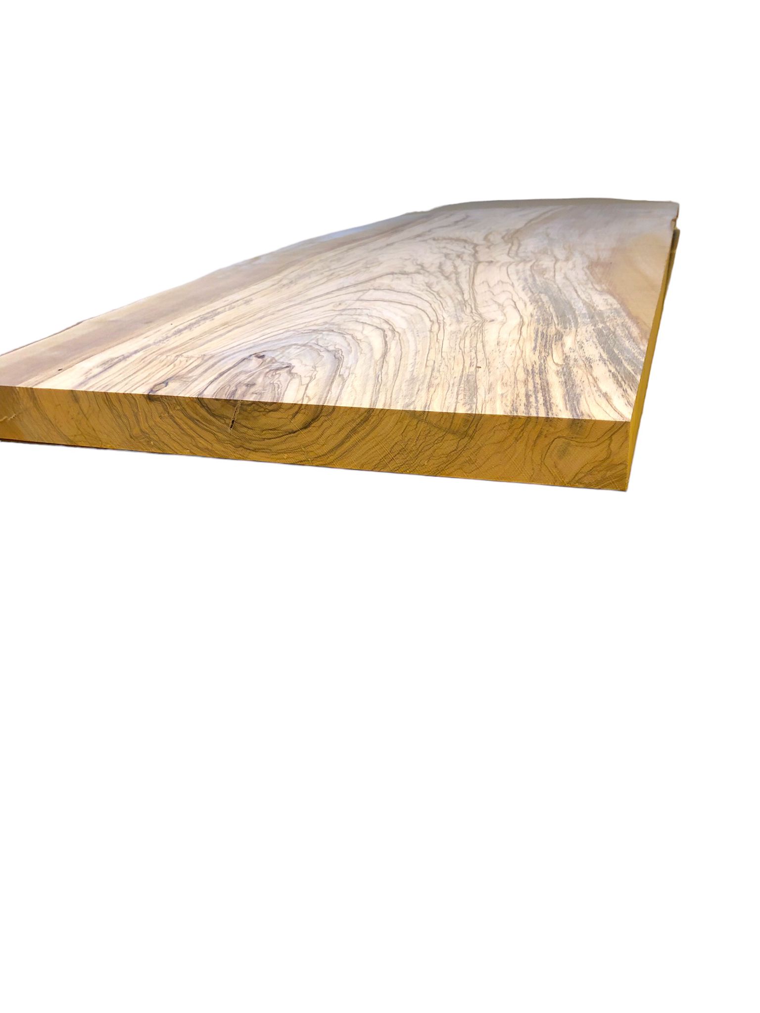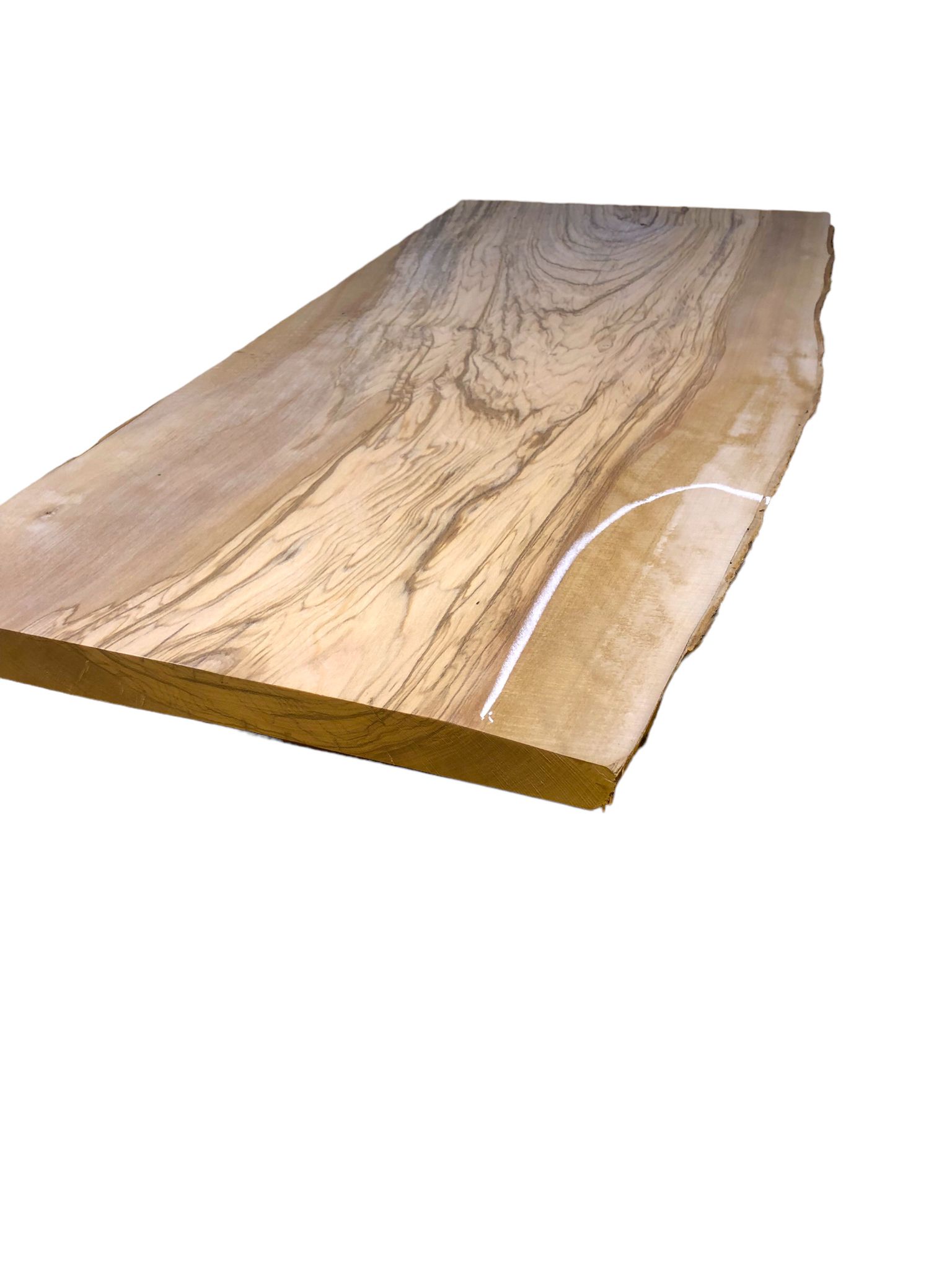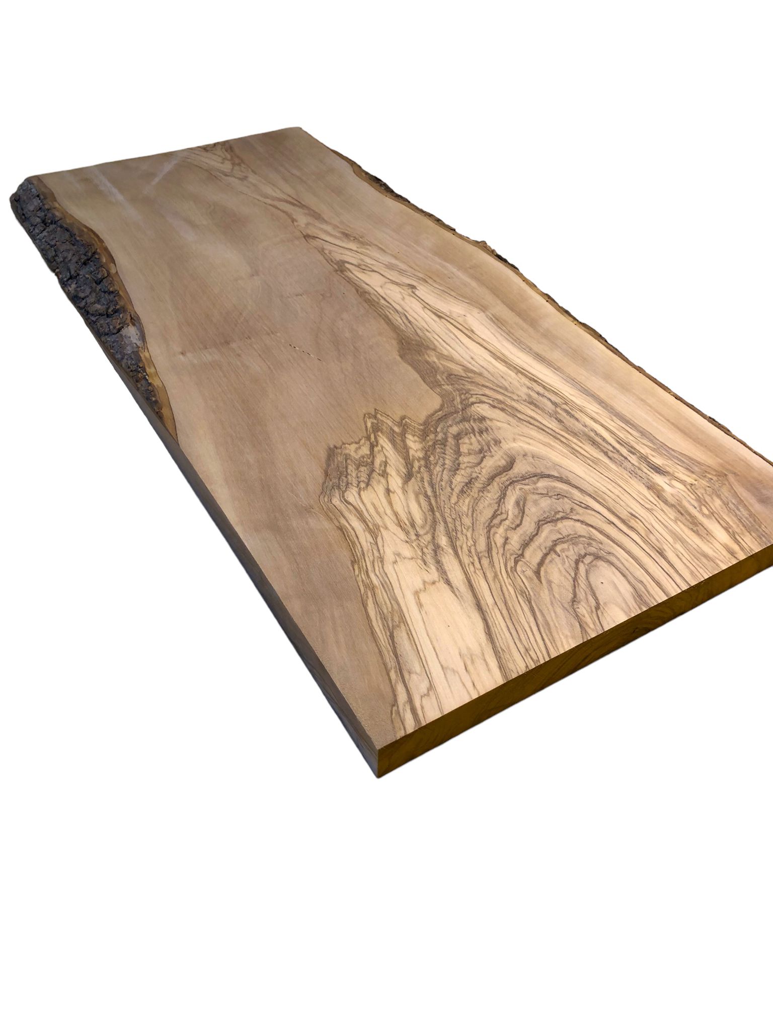 Dieses selten große Olivenbaumbrett überzeugt durch eine besonders ausgefallene Struktur und liegt plan auf, ohne Risse. Lediglich an einer markierten Stelle ist es etwas dünner, was sich ideal als Unterseite nutzen lässt. Perfekt gehobelt und vorgeschliffen, ist das Brett bereit für verschiedenste kreative Anwendungen.