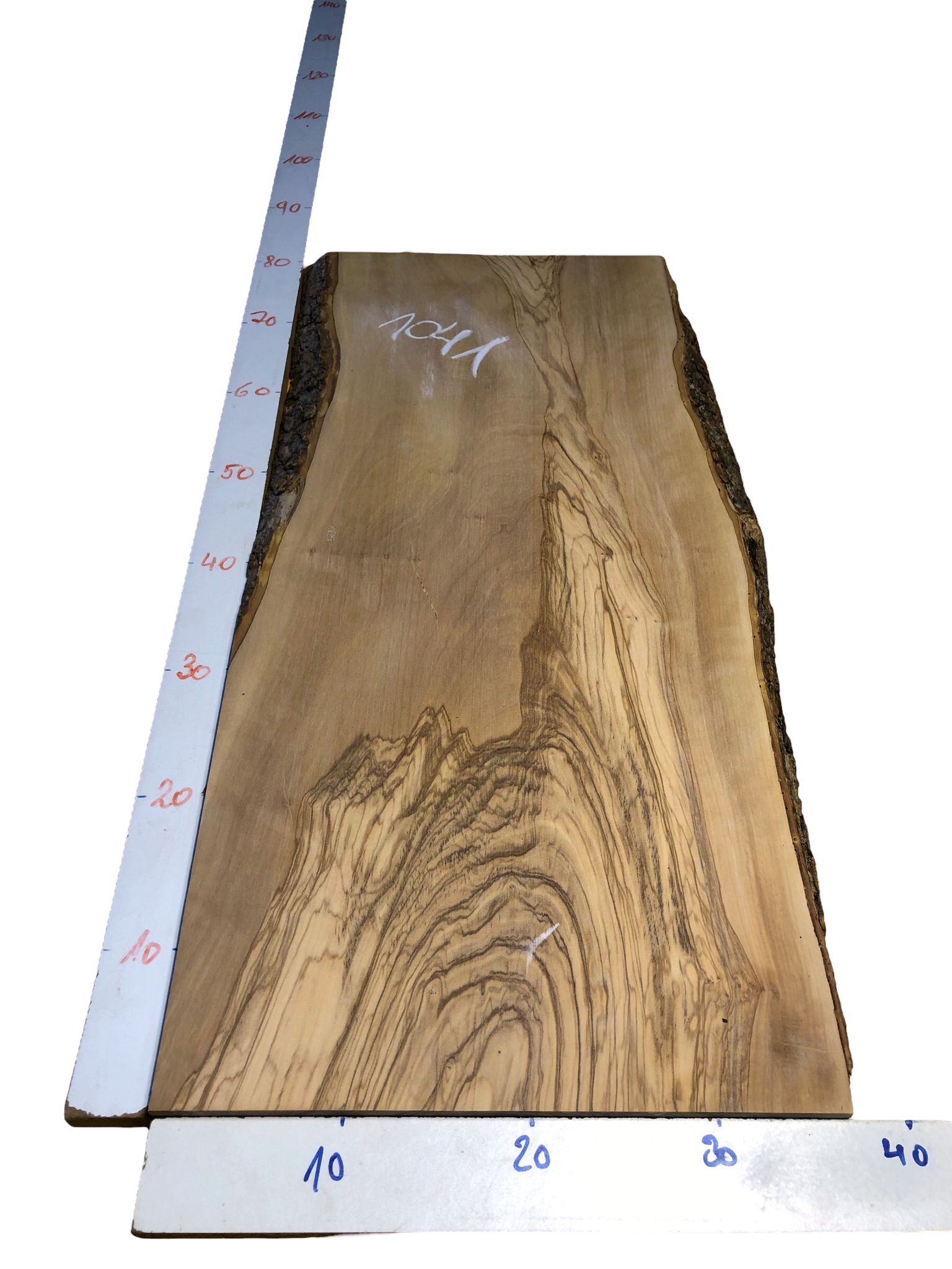 Das Brett wurde über 5-6 Jahre schonend an der Luft getrocknet und hat die Maße von ca. 79,4 x 36,5 - 40 cm bei einer Stärke von 3,2 cm (2,5 cm an der markierten Stelle).