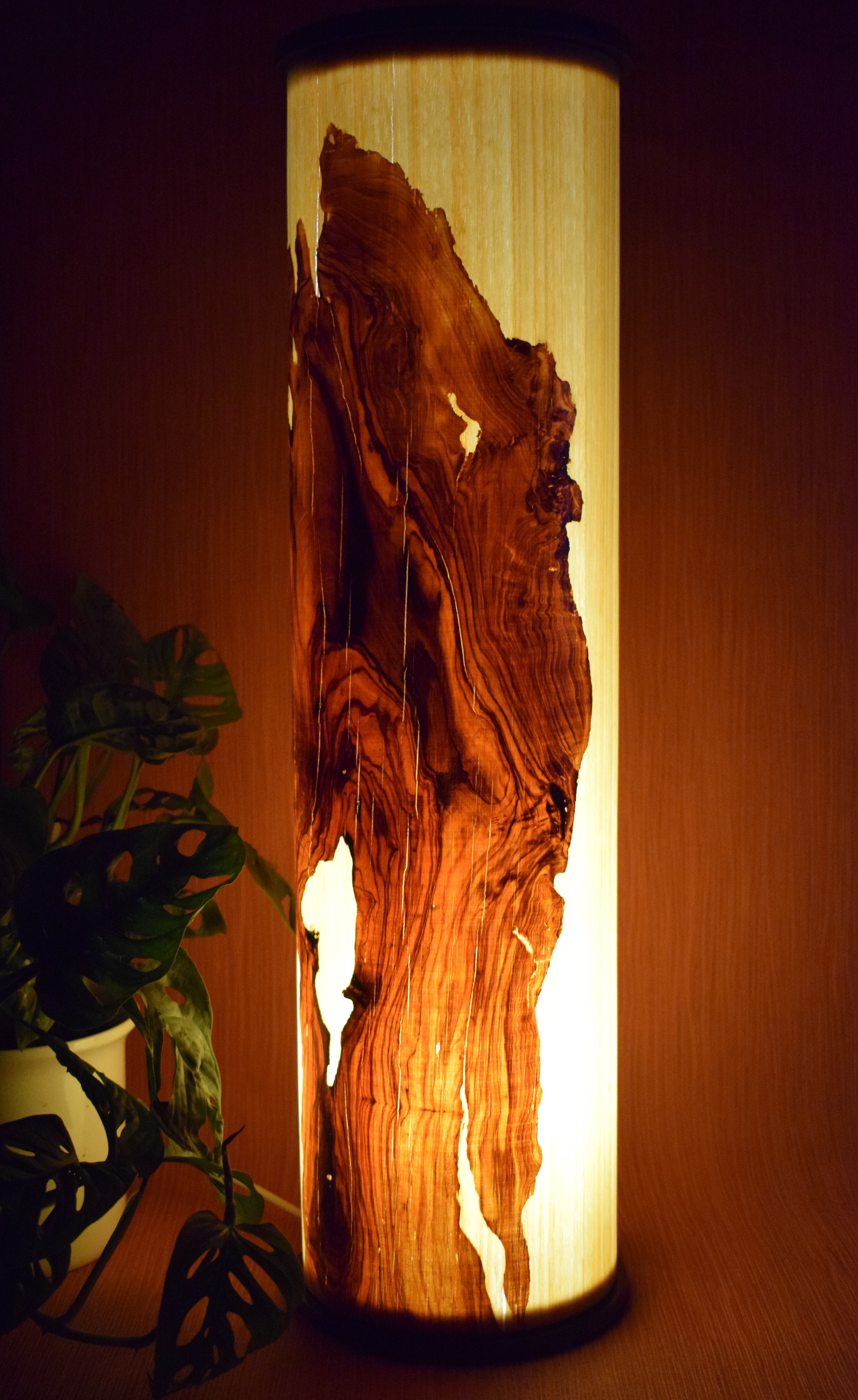 Ob als Schreibtischlampe oder Nachttischlampe, diese atmosphärische Lichtsäule mit speziell aufgearbeitetem Olivenholz Furnier schenkt jedem Raum ein warmes und stimmungsvolles Ambiente.