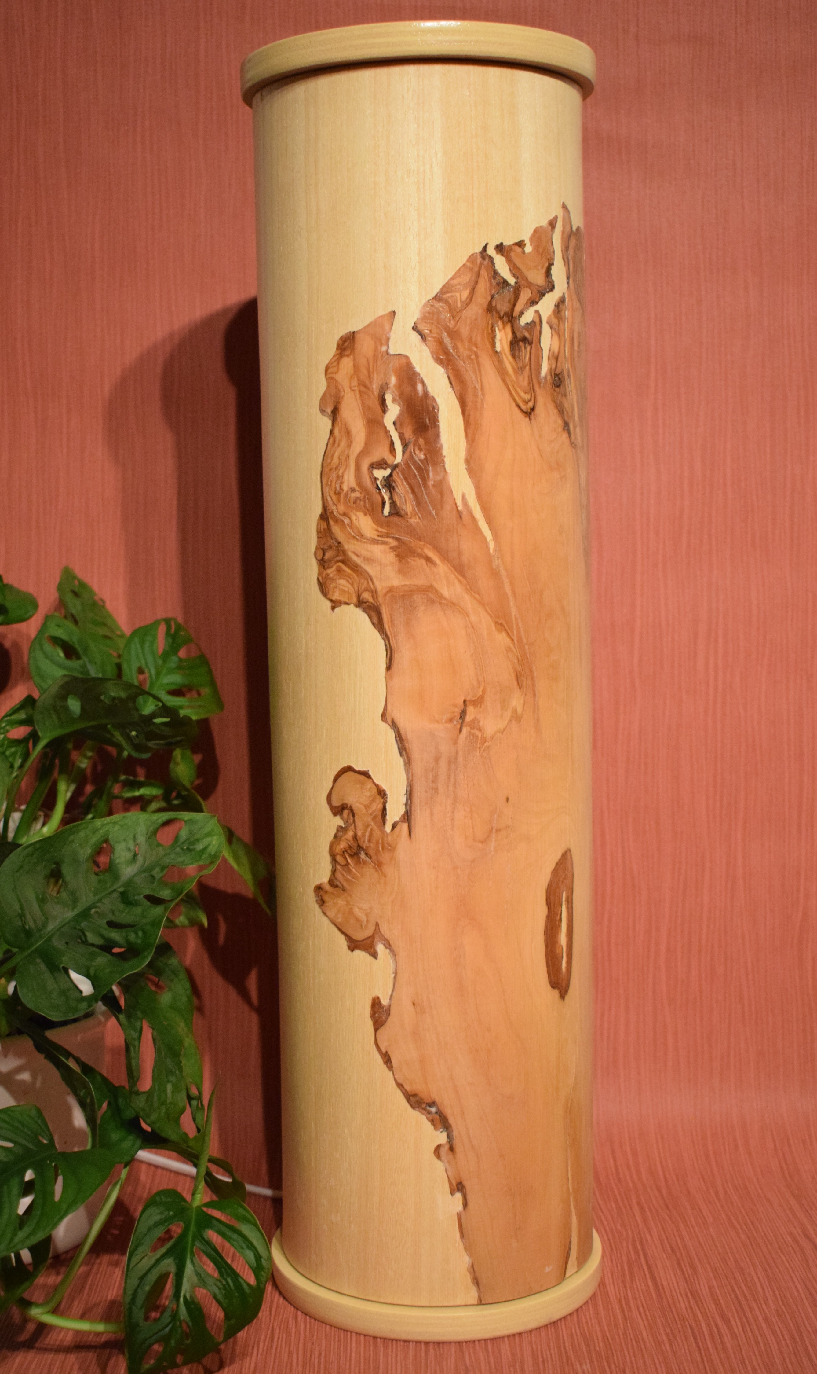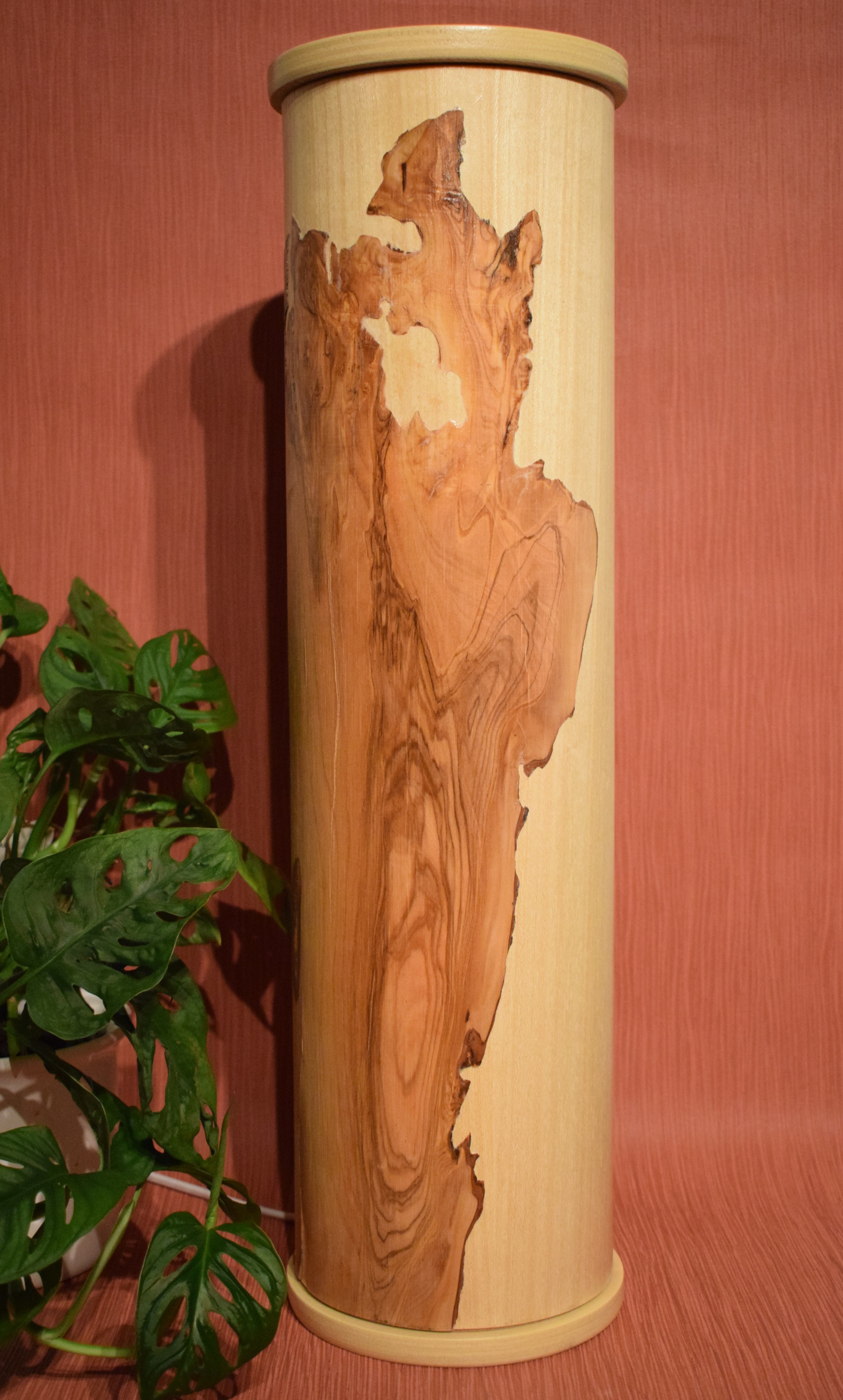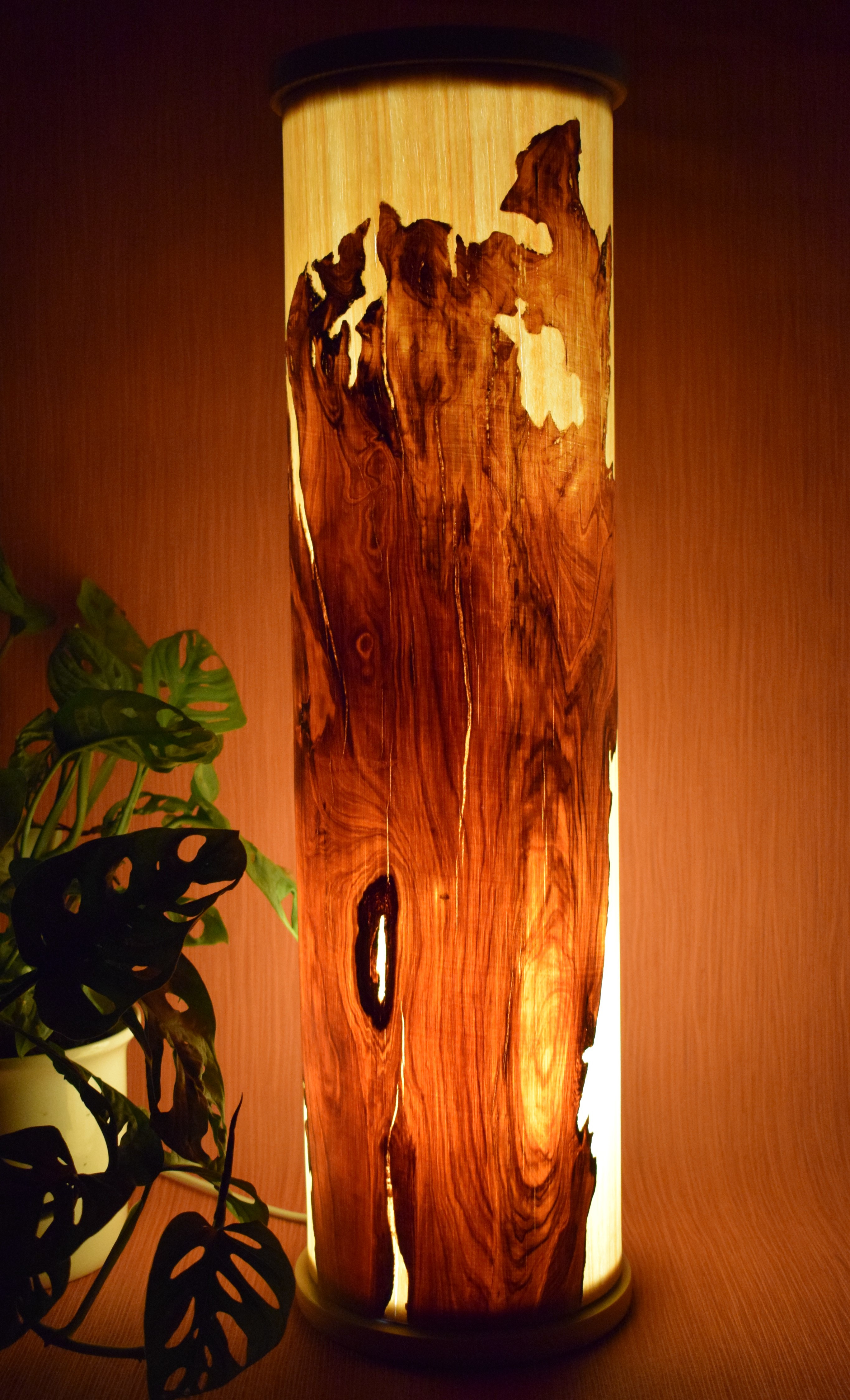 Ob als Schreibtischlampe oder Nachttischlampe, diese atmosphärische Lichtsäule mit speziell aufgearbeitetem Olivenholz Furnier schenkt jedem Raum ein warmes und stimmungsvolles Ambiente.